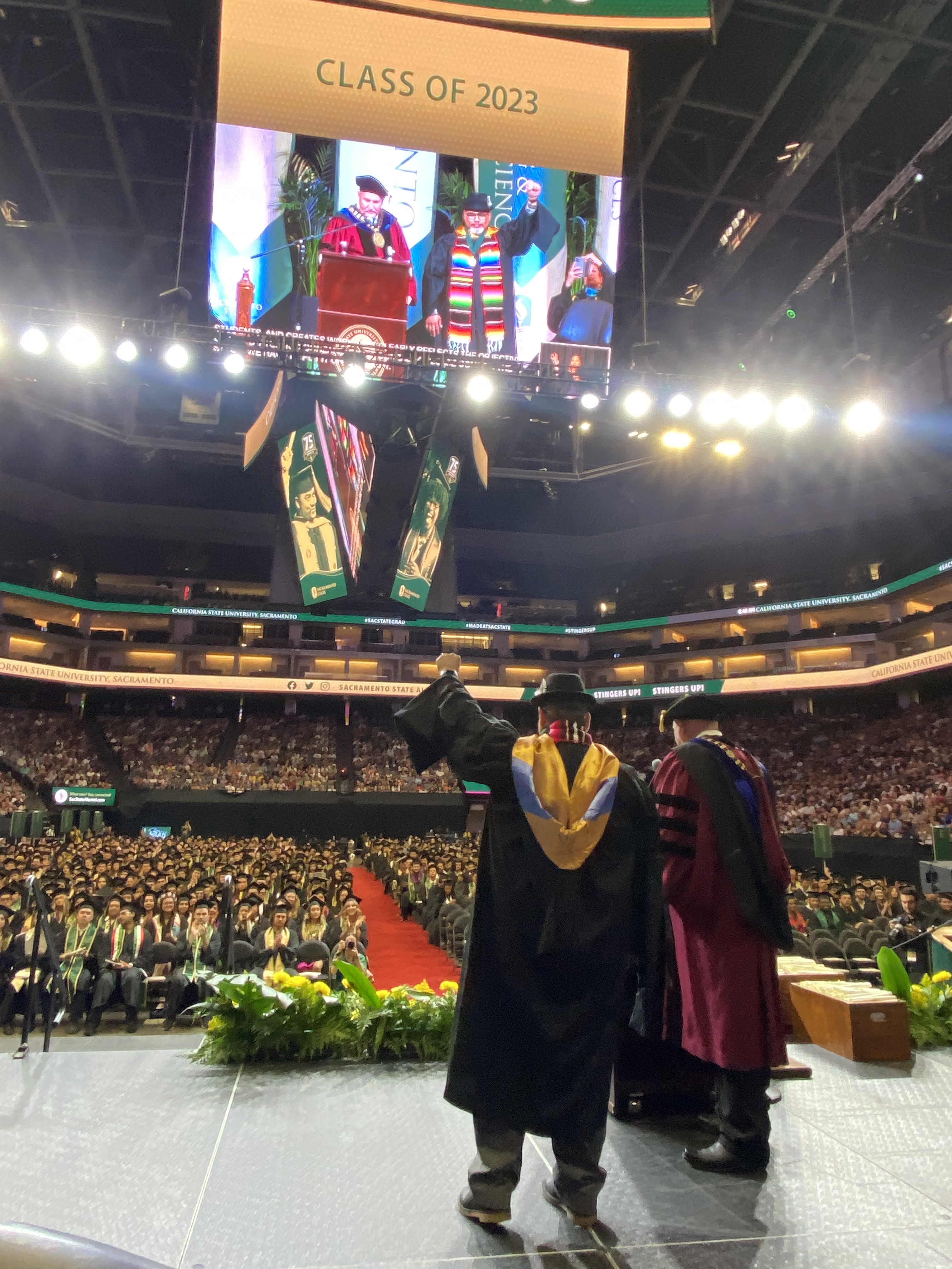 For the second event, I participated in the College of Arts & Letters Commencement Ceremony at the Golden 1 Center on Friday, May 19th, 2023. In front of the graduating class, President Nelson awarded me the Sacramento State President’s Medal for Distinguished Service. It was such a beautiful and empowering ceremony. I shed tears, but not because I was awarded this medal. I shed tears when Sacramento State President Robert Nelsen asked the graduates to stand if they were the first individuals in their families to earn a college degree, and about two thirds of them, around 750 graduates stood up and rejoiced in their loved ones applauses and cheers. I kept shedding tears when President Nelsen asked parents to stand up, and they rejoiced in the children’s applauses and cheers. It continued when the president asked grandparents to stand, and then spouses, and finally the graduates’ children. Everyone’s eyes were hella watery, no lie. It was a great morning! This was the first ceremony of seven. Over 9,500 students are graduating from Sacramento State over the next three days. President Nelsen stated that Sacramento State changes lives right before he asked the first generation graduates to stand to prove his point. I am here to tell you that Sacramento State does changes lives, it changed mine.